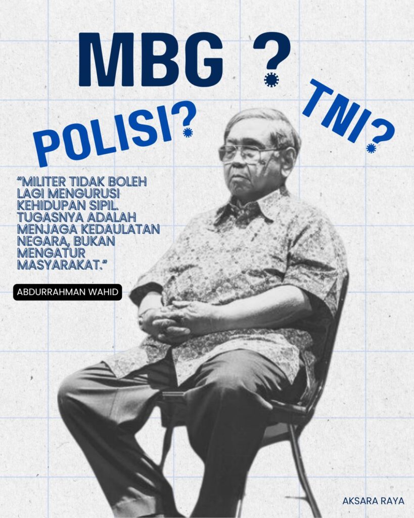 Program MBG sendiri dijalankan melalui dapur Satuan Pelayanan Pemenuhan Gizi (SPPG) yang tersebar di berbagai daerah. Sejak masa reformasi, Gus Dur dikenal sebagai tokoh yang mendorong profesionalisme aparat negara dengan memisahkan peran militer dan kepolisian. Ia menilai kedua institusi tersebut harus kembali pada fungsi utamanya masing-masing agar kehidupan sipil tidak lagi berada di bawah bayang-bayang aparat negara.